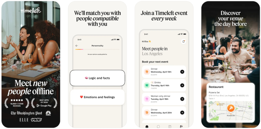 Timeleft helps users organise weekly group dinners with strangers. The app's algorithm matches participants based on age, gender, and personality. Users are grouped with four others and receive limited details about their matches — such as occupations and zodiac signs — the night before the dinner.